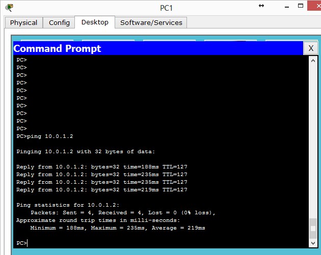 We can verify WAN connectivity by pinging each PC from each other. I’m going to demonstrate PC3 pinging PC1: